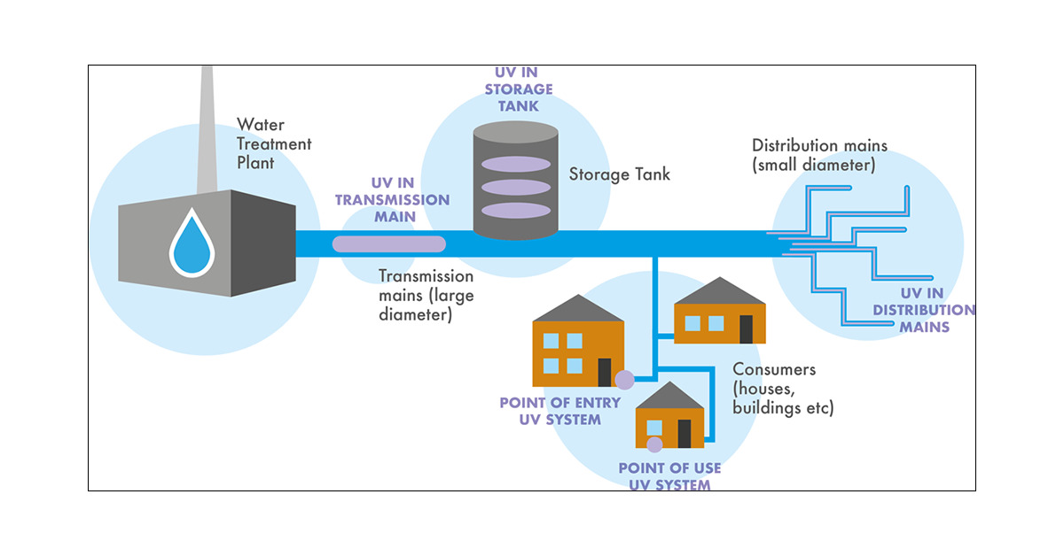 همچنین در سیستم گندزدایی UV بدون افزودن مواد شیمیایی طیف گسترده ای از میکروارگانیسم ها (میکروب و باکتری ها) را در آب نابود می سازد. بدین صورت که دسته ای از اشعه های UV به داخل سلول باکتری نفوذ کرده و با اثرگذاری رویDNA ، امکان تکثیر آن را از بین برده و باعث نابودی آن می شود.